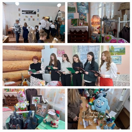 Сегодня в День матери в школьном музее расположилась выставка "Золотые руки наших мам". Гостей выставки встречали ученики 10 класса с классным руководителем Гусевой Н.А. и хранительница музея Колпакова Е.Г.