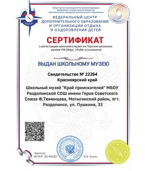 Положение о школьном музее МБОУ Раздолинкой СОШ имени героя Советского Союза ФёдораТюменцева